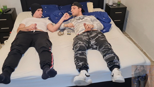 Gay couple smoking, kissing, wanking their big dicks, blowing and cumming on the ashtray